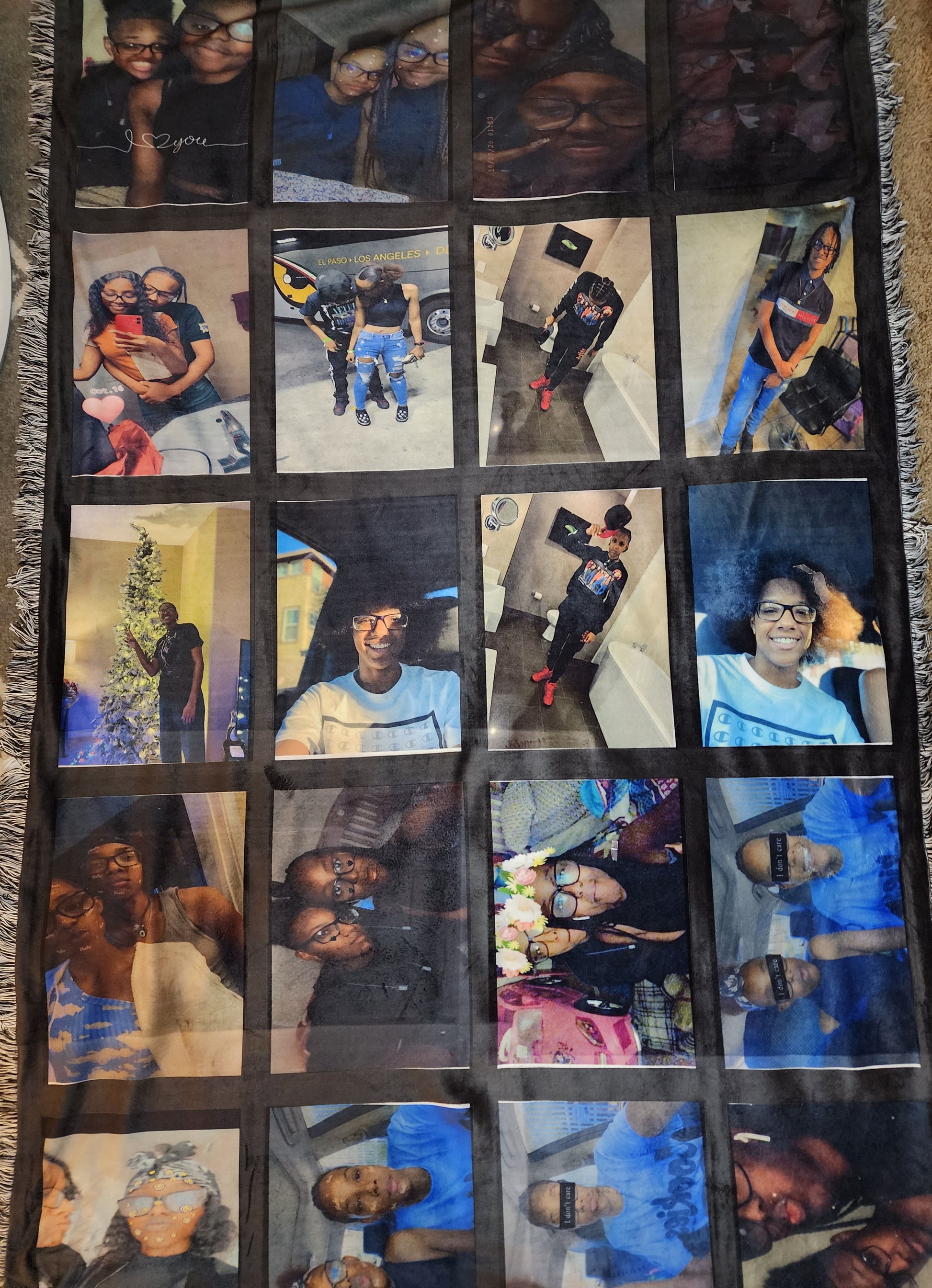 20 Panel Photo blanket with tassels 40x60 in size. Soft to the touch. Photos on one side and all black on the other side. Great gift for any occasion, birthday, anniversary, or memorial.