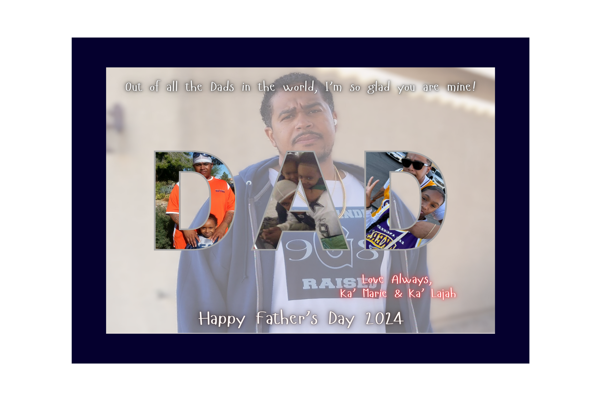 Celebrate the unwavering love and protection of your dad with our customized Dad/Pops/Daddy Poster. Each word is adorned with a special picture capturing the moments shared with the man who has given his heart to his little girl. Available in sizes 8x10, 11x17, and 13x19, is designed to express your deepest love and appreciation. It's a standout piece that will make even the proudest of dads beam with pride and joy, adding a touch of heartfelt sentiment to any room. (Frame not included)