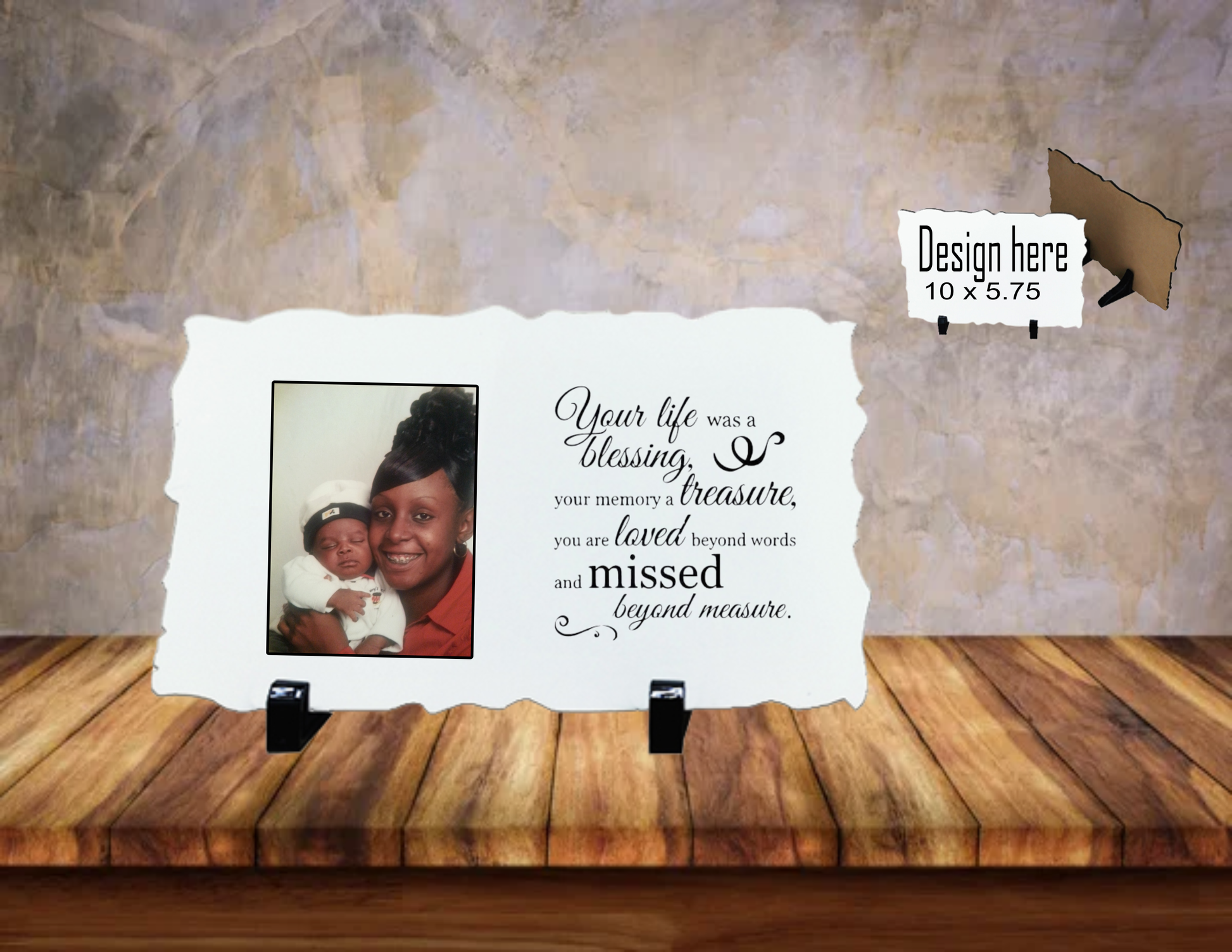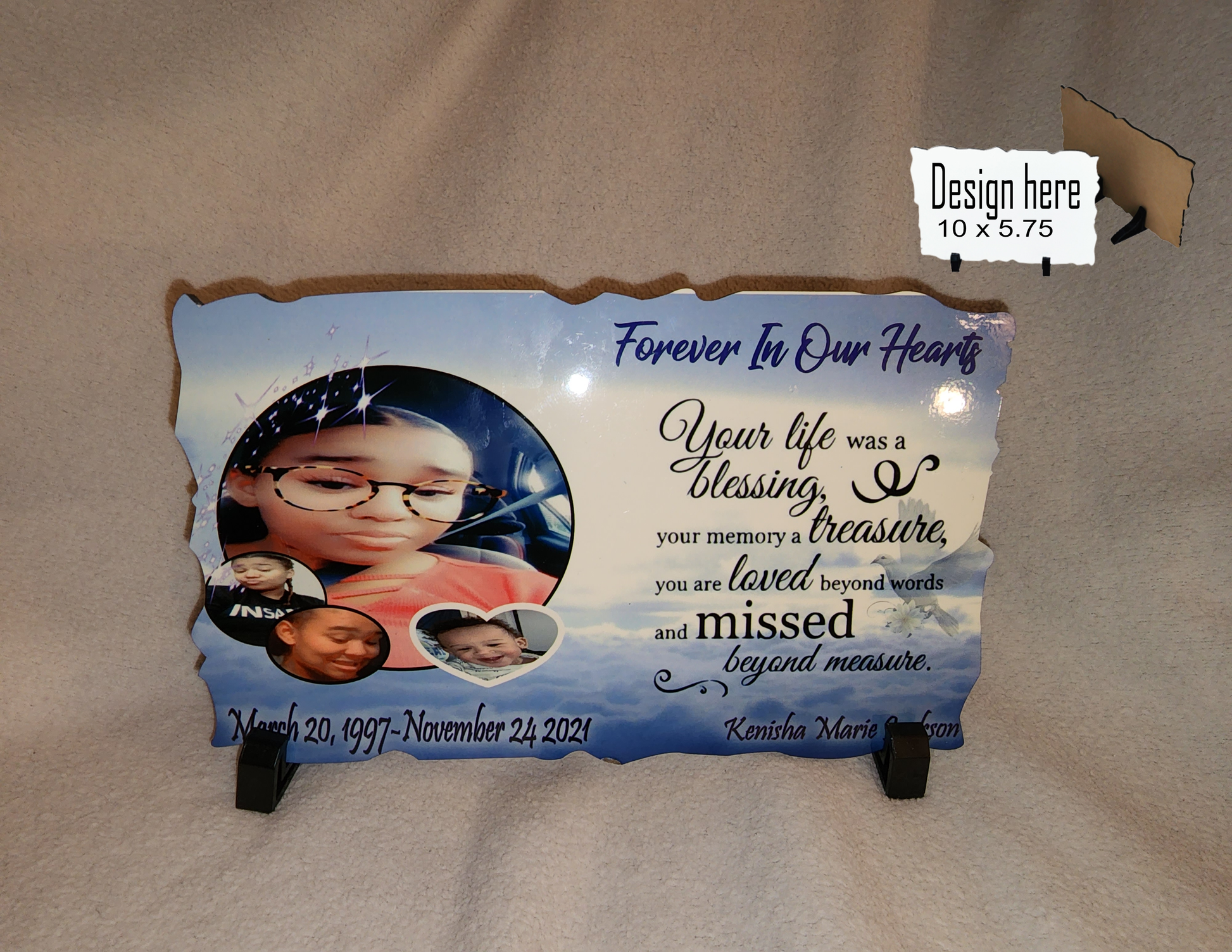 Grief may change with time, but the love we hold for those who've left us remains unwavering. Our customizable manufactured wood piece is designed to celebrate the lives of those we hold dear. Measuring 10 x 5.75 inches, it provides a canvas for you to add a cherished photograph and a meaningful quote, creating a tribute that perfectly reflects the essence of your loved one. This heartfelt creation isn't just a keepsake; it's a way to intertwine their memory into the tapestry of your daily life. With two elegant black plastic stands, you can place it anywhere in your home, ensuring that their presence graces every corner.