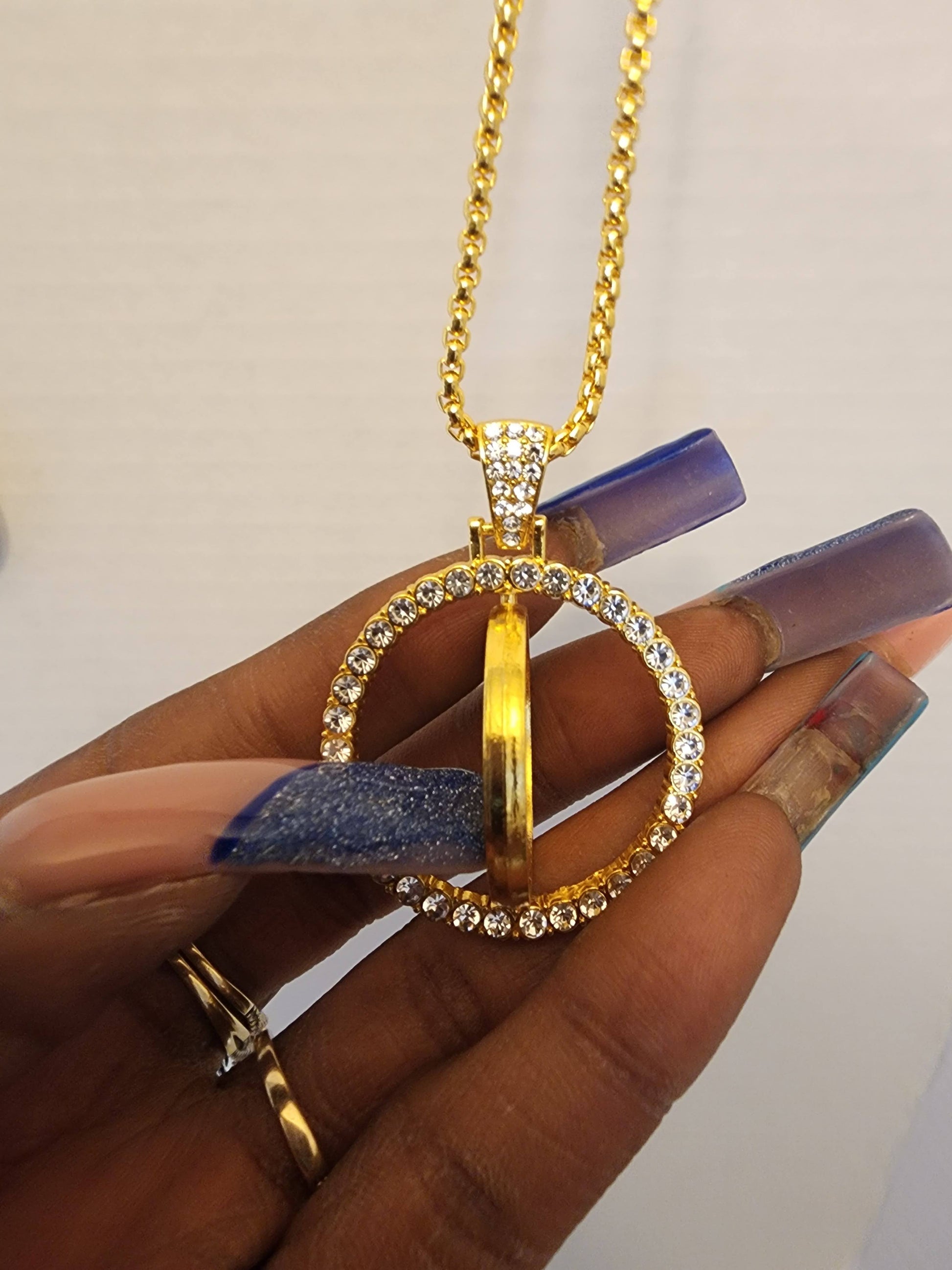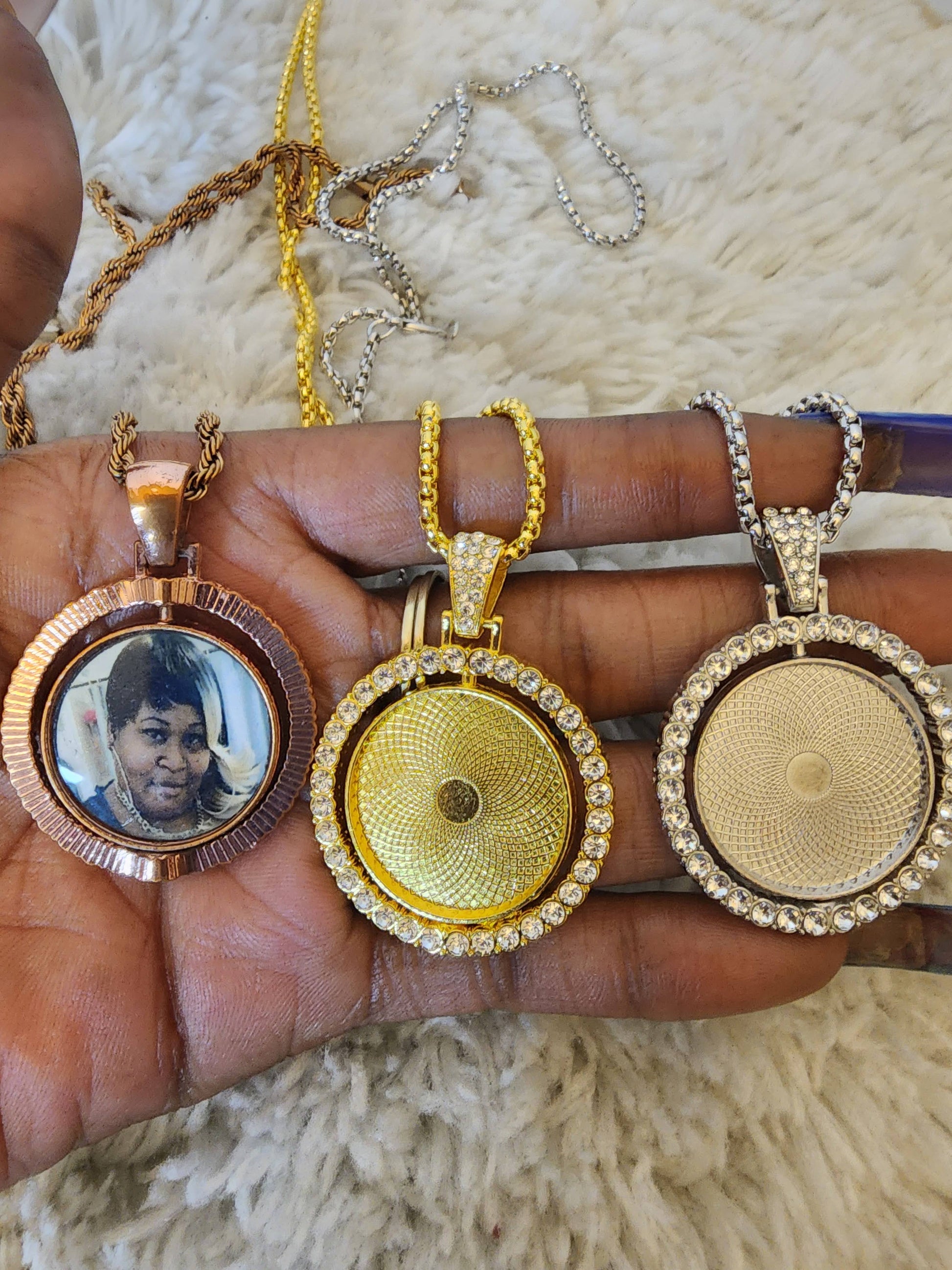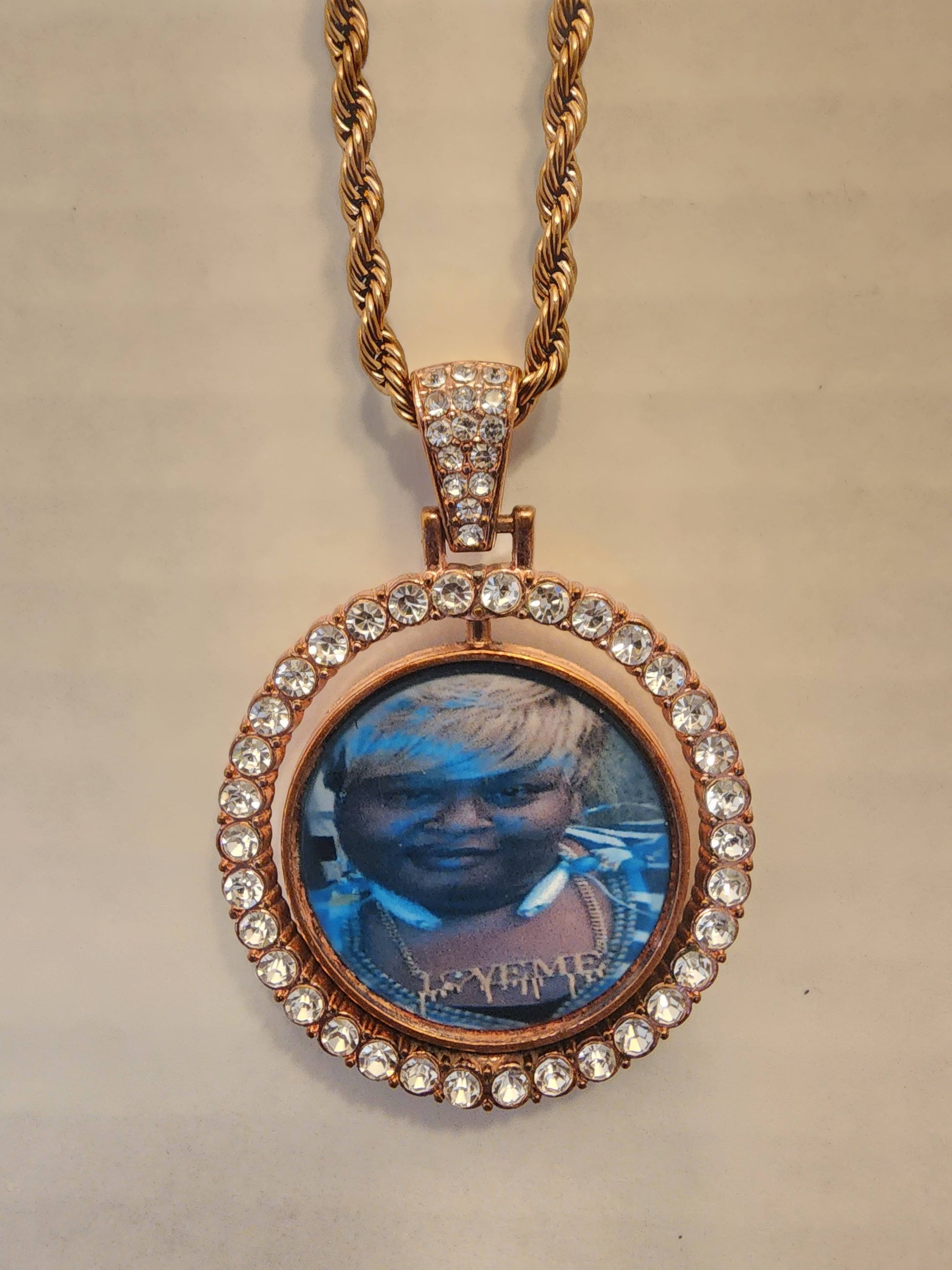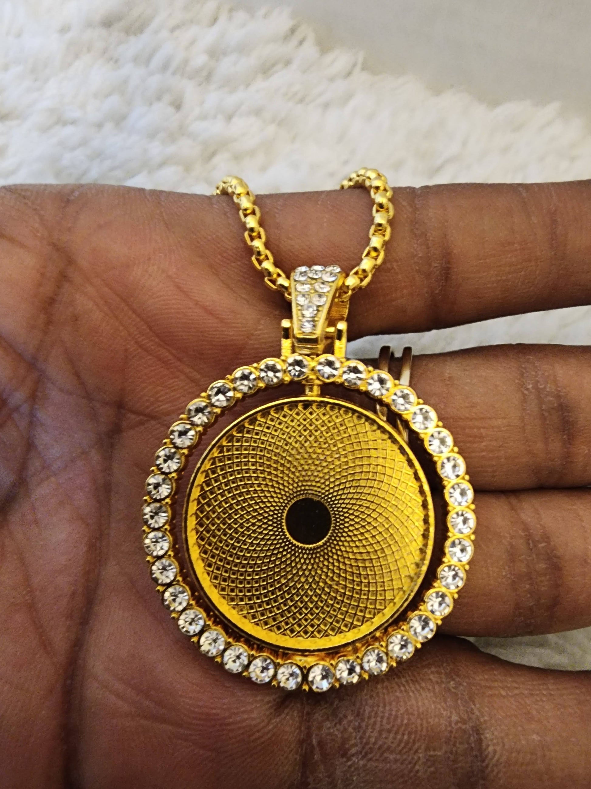 Add a touch of class to your jewelry collection with our rhinestone bezel round necklaces. Available in gold or white, and featuring double-sided personalized photos, these stunning necklaces let you showcase a loved one or yourself in a truly unique way. The charm measures 1.4 inches (3.5 cm) and holds a 0.98-inch (2.5 cm) photo on each side. Personalize yours today and carry precious memories with you wherever you go!